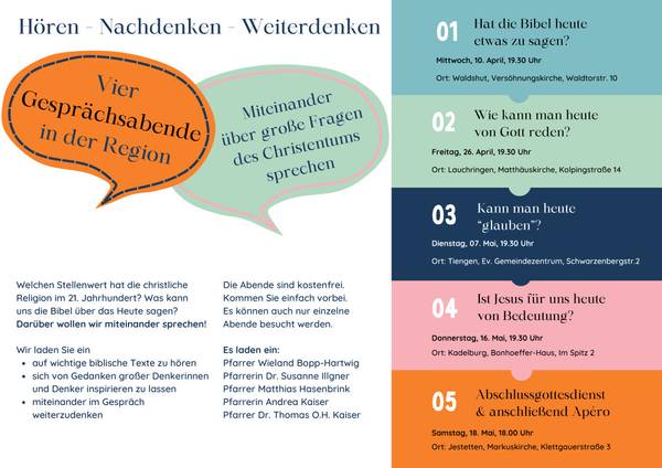 Darüber sprachen Gemeindeglieder und Pfarrpersonen in Waldhut, Lauchringen, Tiengen und Kadelburg. Die Abende waren gut besucht und die Resonanz war so, dass eine Wiederholung im nächsten Jahr geplant werden soll.