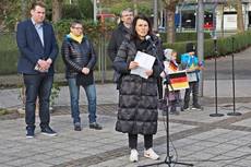 Oberbürgermeister Martin Gruner, Staatssekretärin Rita Schwarzelühr-Sutter und Landtagsabgeordneter Niklas Nüssle sprachen zu den versammelten Menschen und erhielten viel Beifall. Alle missbilligten den Krieg in der Ukraine und sagten den geflüchteten Menschen und der Ukraine Unterstützung zu.