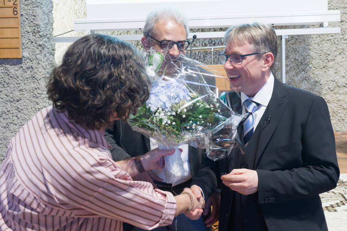 Nach einer kurzen Unterbrechung für einen Imbiss begann der Wahlmarathon. Der einfache Fall war das Leitungsgremium für die Bezirkssynode. Felix Lohrer (Vorsitz), Dr. Susanne Illgner (Stellvertretung), Marke Tschann und Niklas Rupp (Schriftführer) wurden einstimmig gewählt. Nach der Wahl von Felix Lohrer erhoben sich die Synodalen zum Applaus. Dekan Markus Wagenbach überreichte dem frisch wiedergewählten Lohrer das goldene Ehrenamtskreuz der badischen Landeskirche. Es wird für herausragende und langjährige Leistungen in verantwortlicher Tätigkeit im Ehrenamt verliehen. Carola Wagner überreichte einen Blumenstrauß. Man konnte Felix Lohrer die Rührung ansehen.
